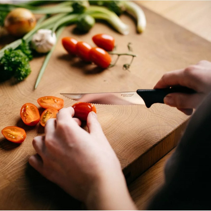 FISKARS Essential snídaňový nůž s vlnitým ostřím je praktický víceúčelový nůž vhodný pro každodenní použití v kuchyni. Díky délce čepele 12 cm a pilkovitému ostří je ideální pro krájení potravin s křupavou kůrkou nebo slupkou, jako jsou rajčata, bagety, pečivo nebo steaky.