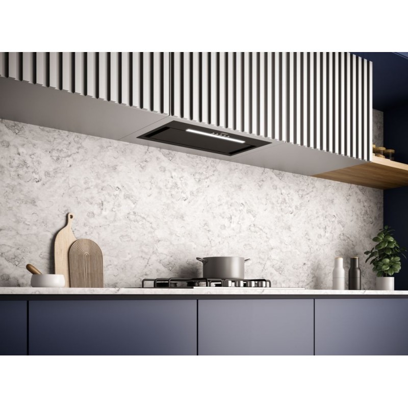 Vestavný odsavač par Box Flush Evo. Provedení Matná černá (NCS S 9000-N). Energetická třída B. Tlačítkové ovládání. Štěrbinové odsávání. 3 Stupně výkonu. Intenzivní stupeň.
