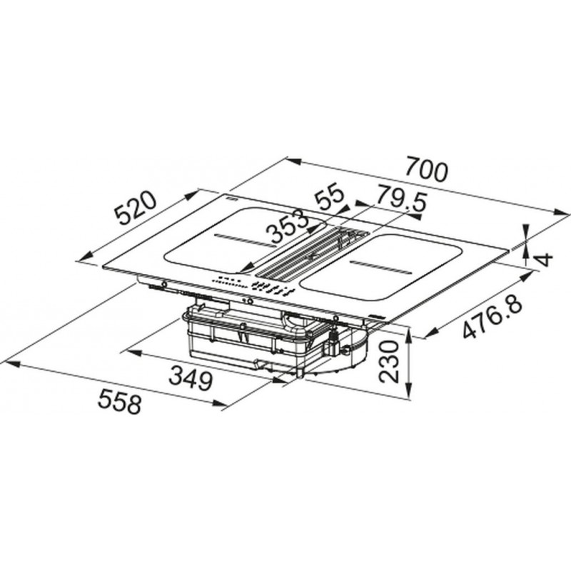 Odsavač par v indukční varné desce Smart 2Gether Black Lines. Provedení černé sklo. Energetická třída A+. Odsavač par: Montáž do pracovní desky. Šířka 70 cm. Ovládání: Senzorové. Digitální červený displej + Dotykový ovladač typu Slide. 9 Stupňů výkonu, 1× Intenzivní stupeň. Doběh. Automatická aktivace s varnou deskou. Voděodolný motor. Černá nerezová mřížka. Max. výkon 630 m3/h (Norma EN 61591). Součástí odsavače par je vyjímatelný kolektor na tekutinu (V případě náhodné vylití tekutiny do odsavače par). Indukční varná deska: 4 Varné zóny. 2× Flexi zóna. Ovládání: Digitální červený displej + Dotykový ovladač typu Slide. 9 Úrovní ohřevu. Funkce: Rozpouštění. Booster. Stop&Go. Dětský zámek. Časovač 4×. Odsavač par i indukce jsou perfektně integrovány. Odsávání je aktivováno automaticky, jakmile je varná deska v provozu. MODEL POUZE PRO VNĚJŠÍ ODTAH.