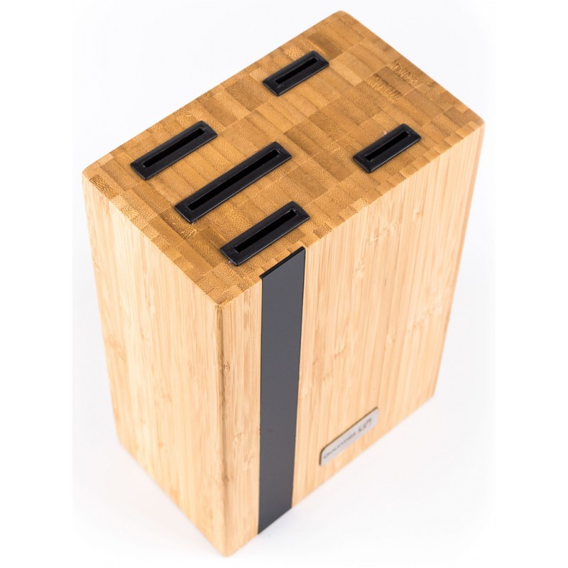 Správná péče o kuchyňské nože prodlouží jejich životnost a ostrost čepelí. Základem správné péče o nože je jejich vhodné ukládání – ideálně do stojanu na nože. Proto k sadě nožů G21 Gourmet Rustic dostanete i originální blok na nože z vysoce odolného bambusového dřeva s elegantní černou kovovou lištou na čelní straně stojanu na nože.