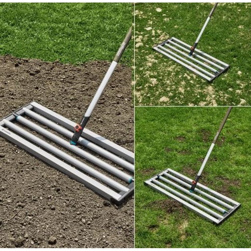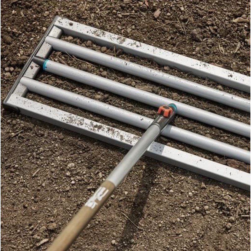 Zaoblené vnitřní panely zajišťují plynulé klouzání po povrchu, zatímco pevná ocelová konstrukce zvládne i náročnější práci s větším objemem materiálu. Nivelační brána je plně kompatibilní se systémem GARDENA combisystem, což umožňuje použití různých typů násad podle vašich potřeb. Uzavřený design zároveň usnadňuje rychlé čištění po práci.