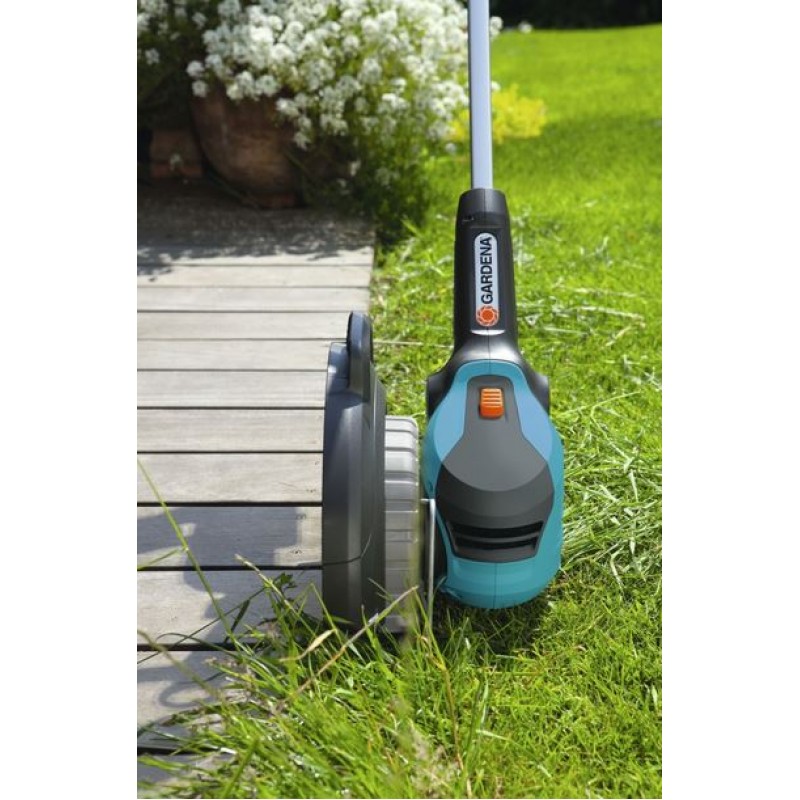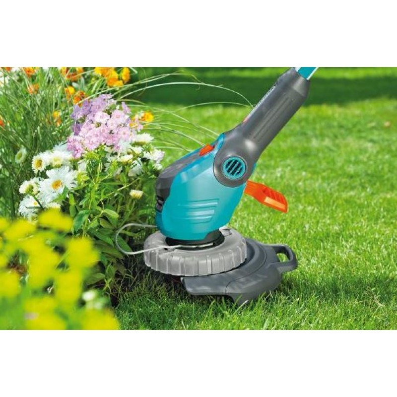 Lehký GARDENA trimmer ComfortCut Plus 500/27, se kterým se extrémně snadno manipuluje, je nejvhodnější pro sekání okrajů trávníku a pro sekání trávy na těžce dostupných místech. Motor s výkonem 500 W je obzvláště výkonný, což znamená, že zajišťuje vysoký a dlouhotrvají sekací výkon. Díky tipovacímu mechanizmu je zajištěno, že má vlákno při sekání vždy správnou délku. Extra dlouhá a snadno nastavitelná přídavná rukojeť zajišťuje pohodlný a ergonomicky optimální postoj při práci. Teleskopickou násadu lze přizpůsobit tělesné výšce uživatele pro ještě větší pohodlí při práci. Při sekání převislých okrajů stačí otočit sekací hlavu o 90°. Integrovaná kolečka umožnují pohodlnou práci. Pracovní úhel, který lze nastavit na hlavě trimmeru, ulehčuje práci na těžce dostupných místech, např. pod trampolínou nebo zahradními lavičkami. Při sekání v blízkosti záhonků nebo květinových řádků je možné použít ramínko na ochranu rostlin. Pro počáteční montáž není zapotřebí žádné nářadí. Průměr sekání celkem 270 mm.Individuální přizpůsobení: