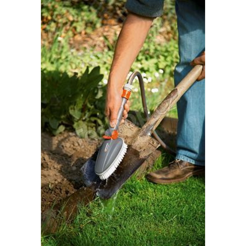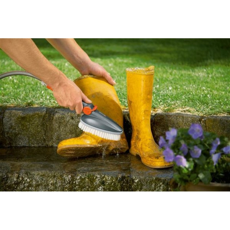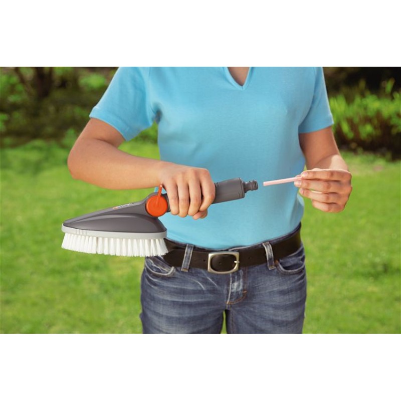 S ručním kartáčem na drhnutí řady GARDENA Comfort připojeným k přívodu vody a vybaveným přípojkou Original GARDENA System lze snadno čistit odolné povrchy. Je vybaven plynule nastavitelnou a uzavíratelnou regulací průtoku. Díky tomu je použití velmi snadné, protože můžete průtok přizpůsobit dané situaci. Ruční kartáč na drhnutí lze snadno používat jednou rukou a díky svému úzkému a plochému tvaru je vhodný pro těsné prostory. Čisticího efektu dosáhnete přidáním mýdlových tyčinek od společnosti GARDENA. Pásek z měkčeného plastu okolo kartáče zabraňuje poškrábání. Uklízení může být tak snadné.Parametry: