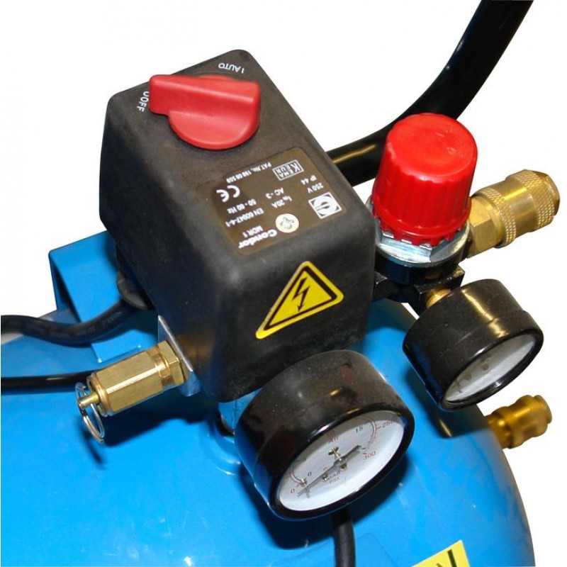 Vybavení: 2 manometry, 2 výstupy tlakového vzduchu (2x u redukčního ventilu ›1x regulovaný tlak), tlakový spínač Condor,