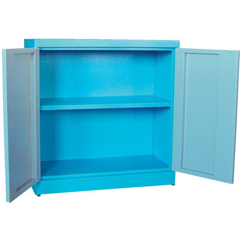 Design ze zaoblenými hranami, prášková metalurgie, celokovová konstrukce, hotově smontovaná, 2 dveře, 1 polička (univerzálně přestavitelná).Uvnitř umístěné kloubové závěsy a zamykací tyče, cylindrický zámek, dvojnásobné uzamčení.