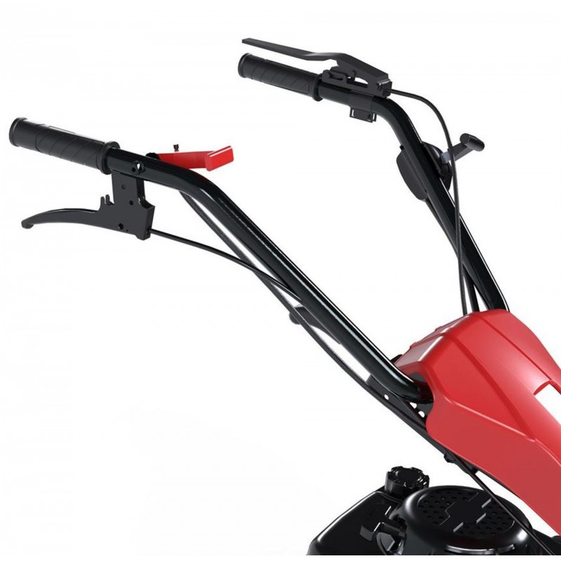 Plynule nastavitelná výška sečení (30–80 mm) umožňuje přizpůsobit výsledek aktuálním podmínkám. Pohon kol spolu s terénními pneumatikami zajišťuje dobrou trakci a usnadňuje práci i v náročnějším terénu. Komfort obsluhy zvyšuje vodicí lišta s tlumením vibrací, která snižuje únavu při delším používání.