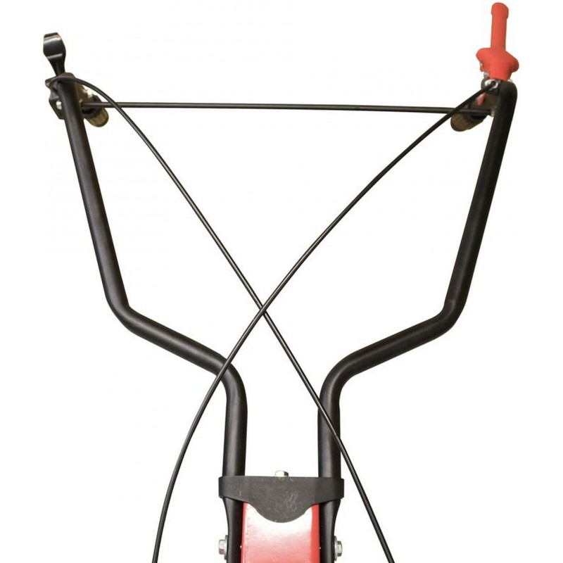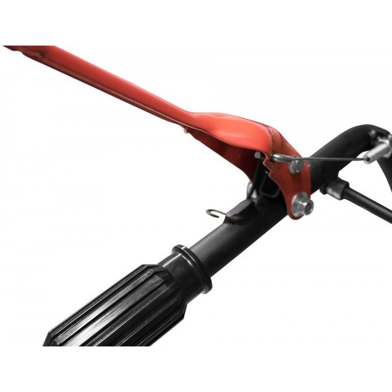 Konstrukce: ergonomicky tvarovaná řídítka s ovládacími prvky, bezpečnostní vypínač, vrchní kryty nožů, opěrná/smýkací tyč, sklopné transportní kolo pro pohodlnou manipulaci (› průměr: 147 mm).