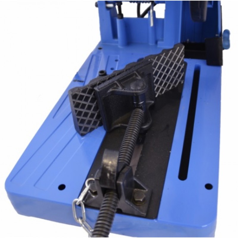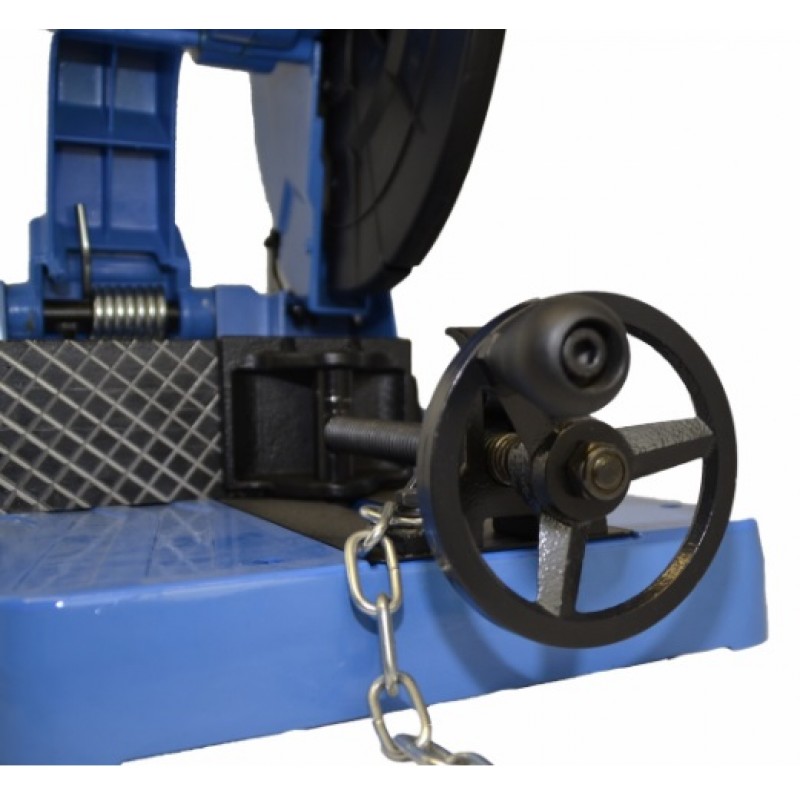 Dvojitý ochranný kryt kotouče, hloubkový doraz (přesné seřízení hloubky řezu), rychloupínací svěrák, stabilní pracovní stůl s prachovou nádobkou.