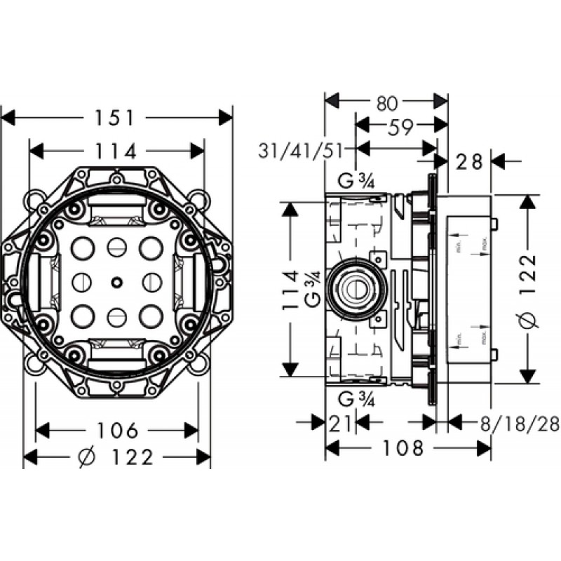 Hansgrohe Základní těleso iBox universal DN15 / DN20 01800180- včetně těsnící příruby, nastavitelné upevňovací příruby, 1 zátky DN20
