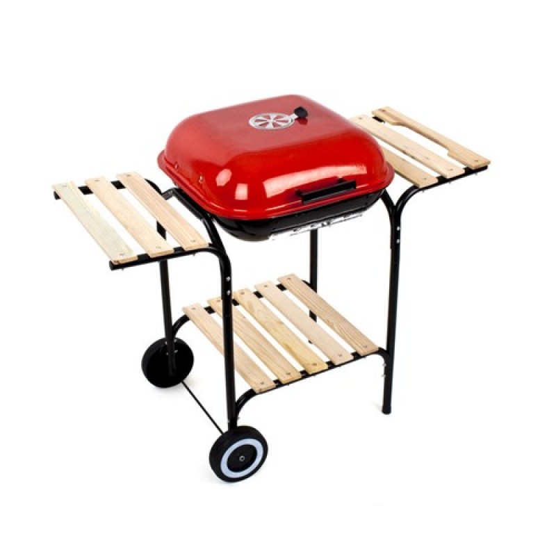 HAPPY GREEN Gril Party 5028018NVelký party gril s dřevěnými odkládacími policemi, rozměr ohniště 45 cm, tloušťka stěny ohniště 0,6 mm, víka 0,4 mm. Povrch ohniště smalt, povrch víka prášková barva - červená, bez možnosti nastavení výšky.