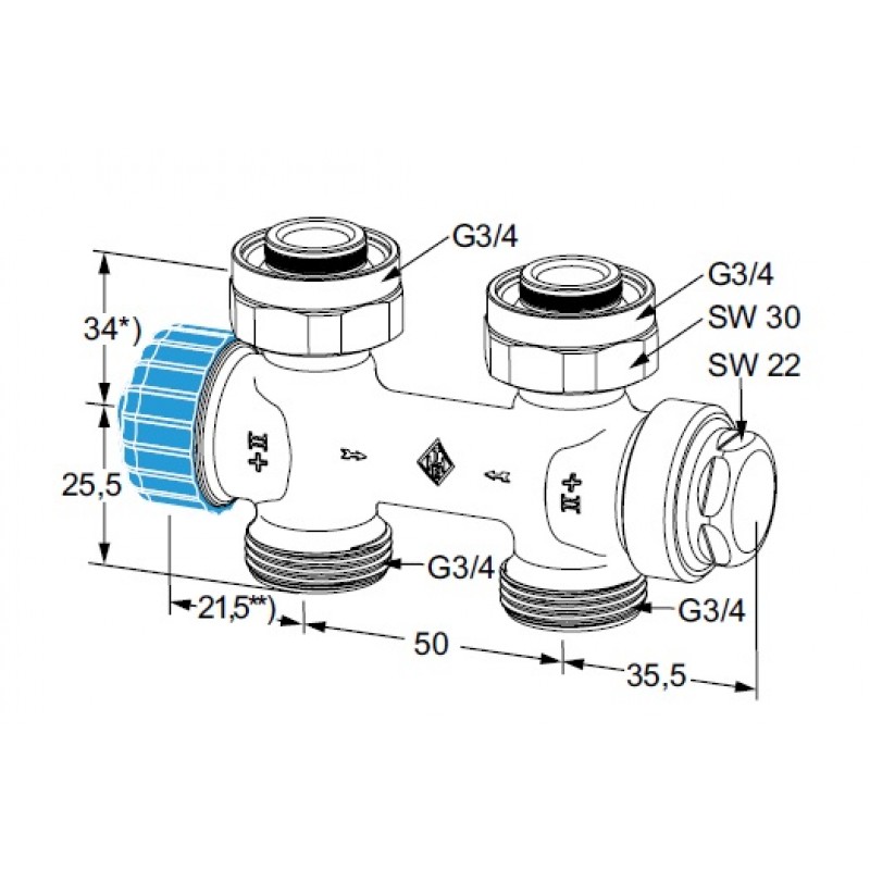 HEIMEIER radiátorový ventil Multilux 3/4", přímý, vnější, jednotrubková s. 3856-02.000Vnější závit.