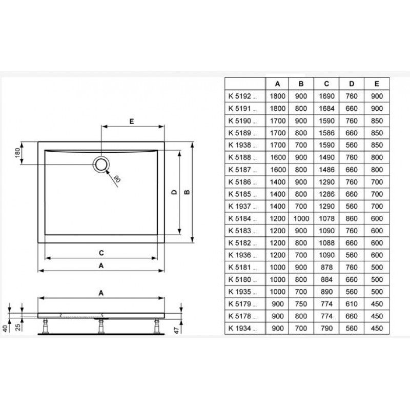 IDEAL Standard ULTRA Flat sprchová vanička akrylátová obdélníková 140 x 80 x 4 cm K518501Průměr odpadu: 90 mm.