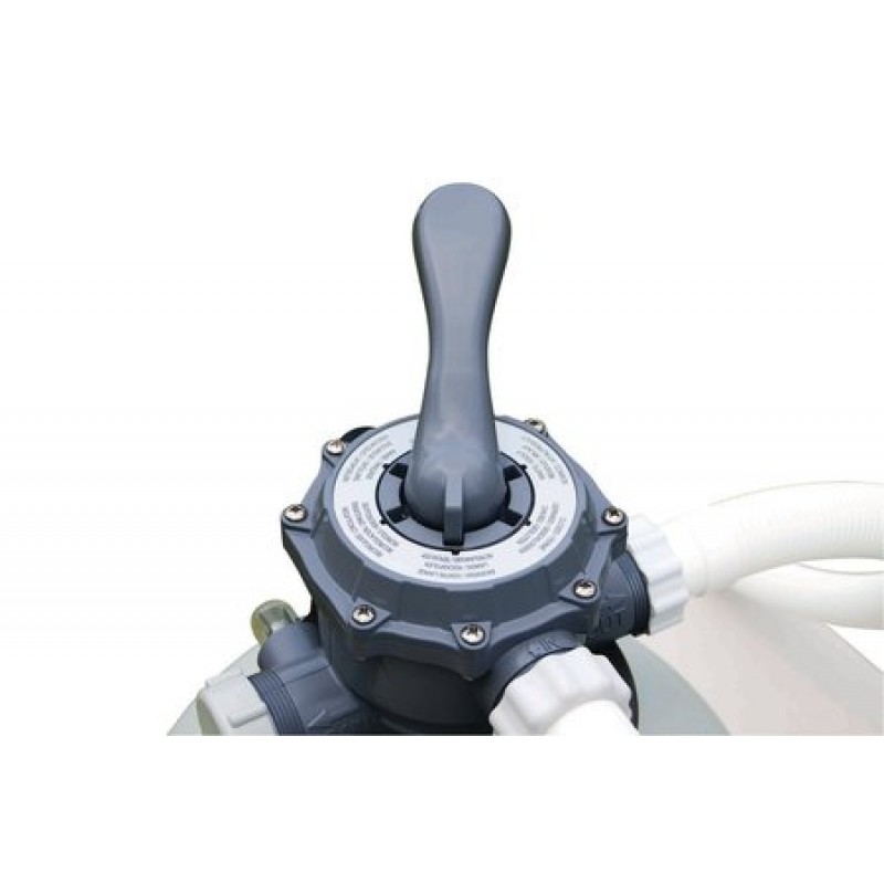 6-cestný ventil pro optimální obsluhu zařízení a průzračnou vodu. Filtrování, zpětný chod, oplachování, cirkulace, vypouštění, uzavření. Díky masivní páce můžete provést kompletní čištění vody aniž byste se museli namočit, něco uzavírat nebo odmontovávat.