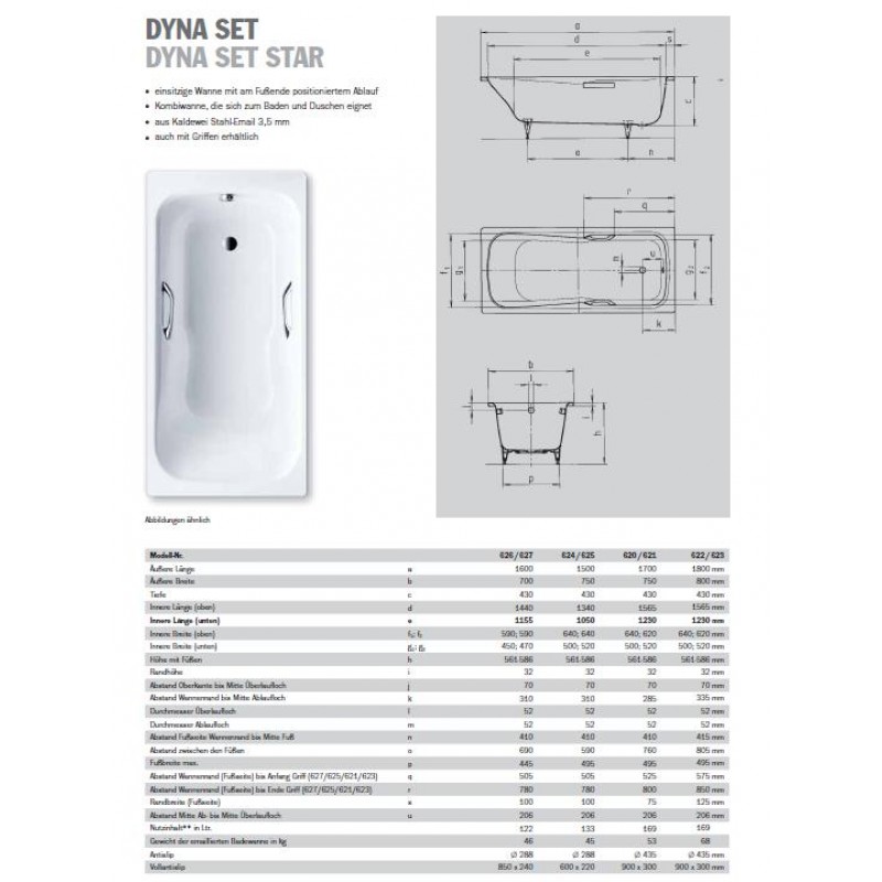 DYNA SET Model DYNA SET/DYNA SET STAR je kombinovaná vana, ideální jak pro koupel, tak ke sprchování. Široké, ploché dno neomezující pohyb se zdá větší než kompaktní vnější rozměry této vany