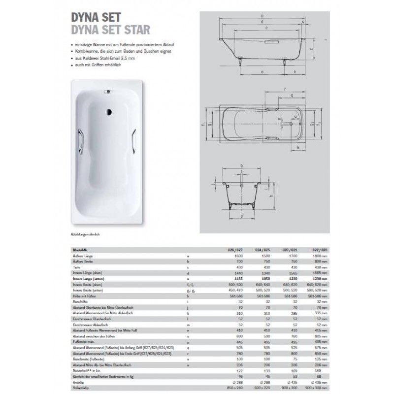 DYNA SET STAR Model DYNA SET/DYNA SET STAR je kombinovaná vana, ideální jak pro koupel, tak ke sprchování. Široké, ploché dno neomezující pohyb se zdá větší než kompaktní vnější rozměry této vany.
