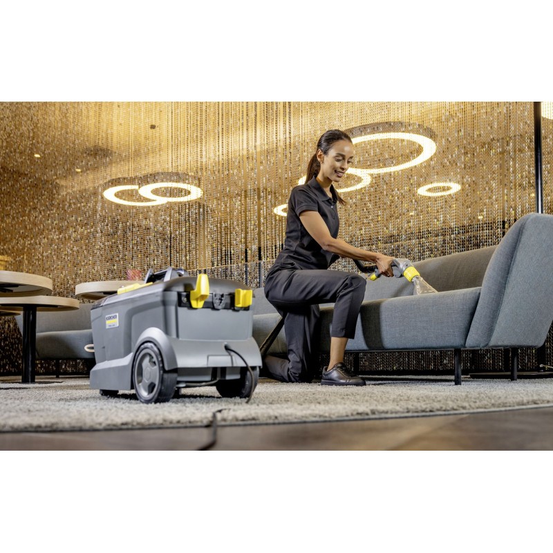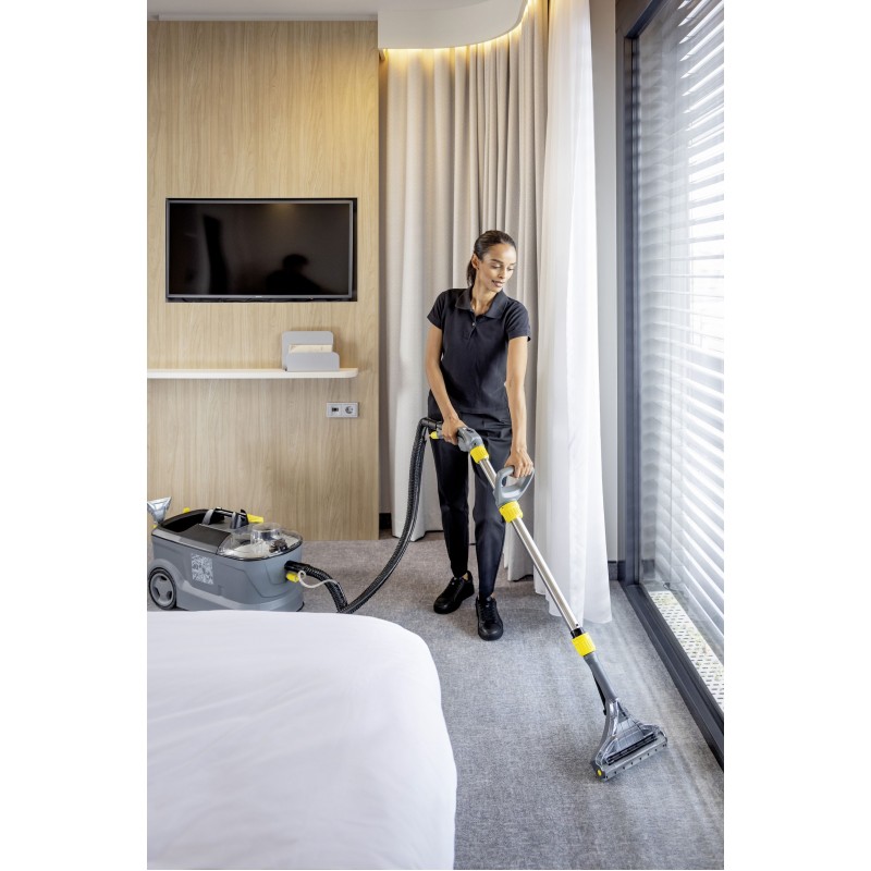 Všestranný extraktor Puzzi 10/1 oceníte při úklidu menších kanceláří a společenských místností. Nástřikový tlak o hodnotě 1 bar umožní šetrné hloubkové čištění koberců a čalounění. Přístroj navíc zanechává povrchy téměř suché, takže je lze vzápětí opět použít. Úzká podlahová hubice se dokonale hodí pro úklid stísněných prostor. Její flexibilní sací stěrka zajistí perfektní kontakt s povrchem, i když vysáváte pod nábytkem. Při péči o čalounění se osvědčí také praktická ruční hubice. Ergonomická, výškově nastavitelná rukojeť zajistí maximální komfort při práci. Úklid ulehčí rovněž objemná 9l nádoba na špinavou vodu, kterou jednoduše vyjmete a vylijete. A když je hotovo, kabel i sací trubky snadno připevníte k přístroji a extraktor pohodlně uskladníte.