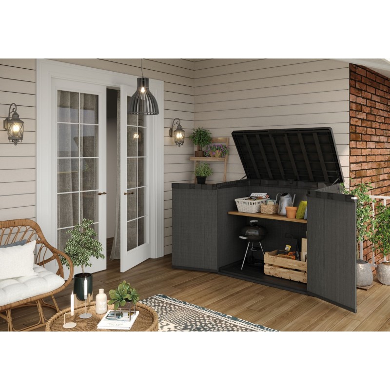 KETER DARWIN 1150L je designová a praktická zahradní skříňka dostupná v barvách zelená, hnědá nebo šedá. Díky velkému úložnému prostoru o objemu 1 150 L je ideální pro ukládání zahradního nářadí, sportovního vybavení, doplňků nebo dokonce popelnic. Elegantní design s povrchem připomínajícím dřevo dodává zahradě nebo terase stylový vzhled, zatímco odolný materiál EVOTECH zajišťuje dlouhou životnost.
