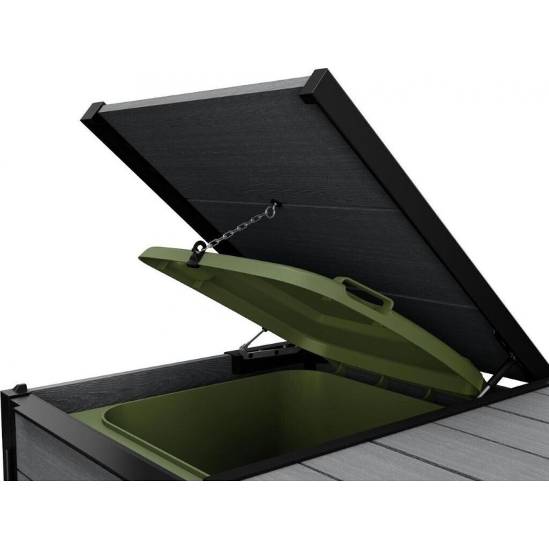 - Praktické otevírání: Dvě samostatná víka umožňují snadný přístup k jednotlivým popelnicím bez nutnosti jejich vyjímání.