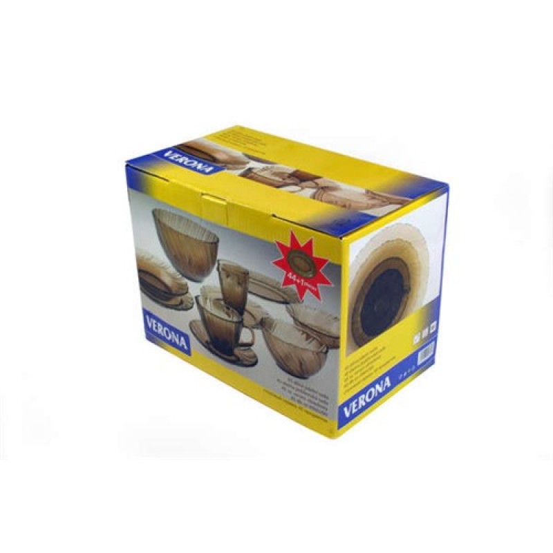 KIG Jídelní sada 45d. Verona 59MI45SAM4545dílná sada nádobí z kouřového skla - 6 tal. měl. 23,2cm, 6 tal. hlub. 20,5cm,6 tal. des.19,5cm,6 šapo 180ml, 6 kompotek 139mm,1 mísa 21,7cm, 1 polévková miska 150mm,6 odlivek 230ml, 1 ovál 25cm.