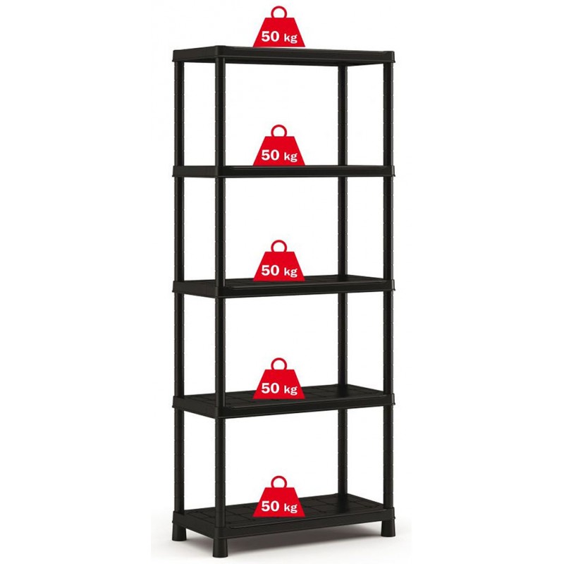 Plastový regál KIS PLUS 80/5 je praktické řešení pro garáže, sklepy, dílny i další úložné prostory. Díky modulární konstrukci, kterou lze složit do horizontální i vertikální polohy, nabízí flexibilní uspořádání a snadný přístup k uloženým věcem. Robustní konstrukce a výškově nastavitelné police zajišťují vysokou stabilitu a bezpečné uložení nářadí, boxů či jiného vybavení. Každá z pěti polic unese až 50 kg, takže celková nosnost regálu je 250 kg. Regál v černém provedení je odolný a snadno se montuje.