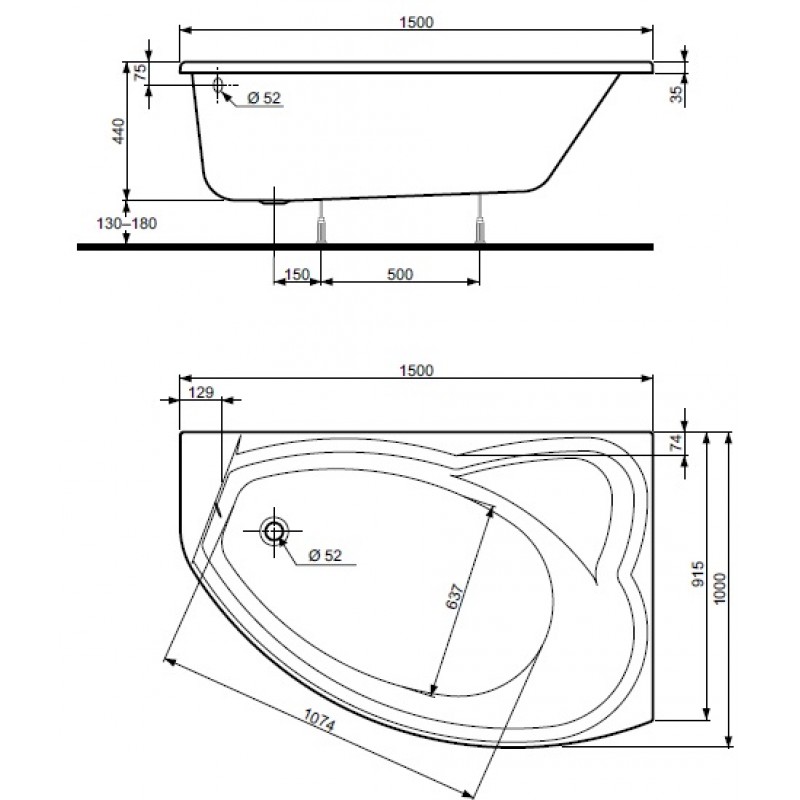 KOLO Agat asymetrická vana 150 x 100 cm, pravá XWA0950000- rozměry: 150 x 100 x 44 cm