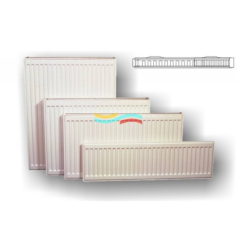 KORAD deskový radiátor typ 22VKL 600 x 700Deskové otopné těleso s levým nebo pravým bočním připojením na otopnou soustavu s nuceným nebo samotížným oběhem. Korad K kompakt má doporučeno křížové připojení. Radiátory KORAD jsou vyráběny z ocelového plechu o síle 1,2 mm vzájemným svárem dvou výlisků po obvodu švovým svárem. Rozestup vertikálních kanálků na výliscích je 33,33 mm, což umožňuje vyrábět deskové radiátory s násobkem délky 100 mm. Na desky mohou být bodově přivařené konvektory, tj. přídavná přestupná plocha vyrobená z ocelového plechu. Jejím účelem je zvětšit celkovou plochu topného tělesa a tak dosáhnout výššího tepelného výkonu. Jednotlivé typové rady radiátorů jsou tvořeny různým počtem desek a konvektorů. První číslo v označení typu znamená počet desek, druhé číslo počet konvektorů. Jednotlivé typy jsou vyráběny ve stavebních výškach 300, 400, 500, 600 a 900 mm, nově též typ určený pro rekonstrukce ve výšce 550 mm. Délka se mění od 400 mm do 3000 mm, může však být pro některé modely omezená. Standardně jsou radiátory vyráběny v bílé barvě RAL 9010. Na zakázku je možné též vyrobit radiátory i v jiných barvách RAL s příplatkem 30%, jakož i pozinkované radiátory do vlhkých prostor a bazénů.