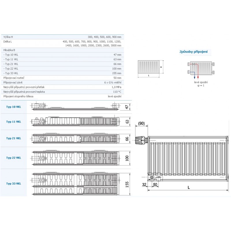 KORADO deskový radiátor typ VKL 22 400 / 600 22-040060-E0-10Model RADIK VKL je deskové otopné těleso v provedení VENTIL KOMPAKT, které umožňuje levé spodní připojení na otopnou soustavu s nuceným oběhem. Ze zadní strany jsou přivařeny dvě horní a dolní příchytky, otopná tělesa o délce 1800 mm a delší mají navařena šest příchytek
