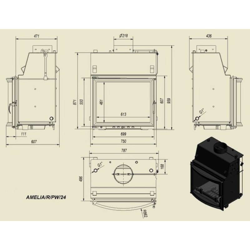 KRATKI AMELIA/R/PW/24 krbová vložka teplovodní, obloukové sklo, bez chladící smyčkyVýkon nominální: 24 kw