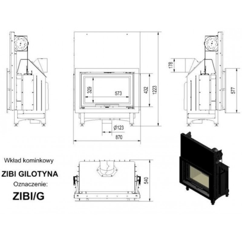 KRATKI ZIBI/G 12 kW, krbová vložka teplovzdušná, výsuvné otevíráníModerní krbová vložka ZIBI vyrobená z kotlové oceli o síle 4 mm se žebrováním po stranách a na zadní stěně. Spalovací komora je vyložena keramikou, tzv. Acumottem. Vzduch pro oplach skla je přiváděn bočními kanály s dodatečnou možností regulace jeho intenzity.