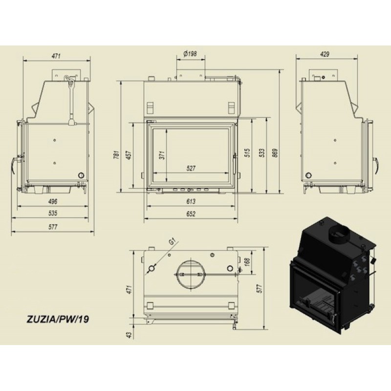 KRATKI ZUZIA/PW/19 krbová vložka teplovodní, rovné sklo, bez chladící smyčkyVýkon nominální: 19 kw