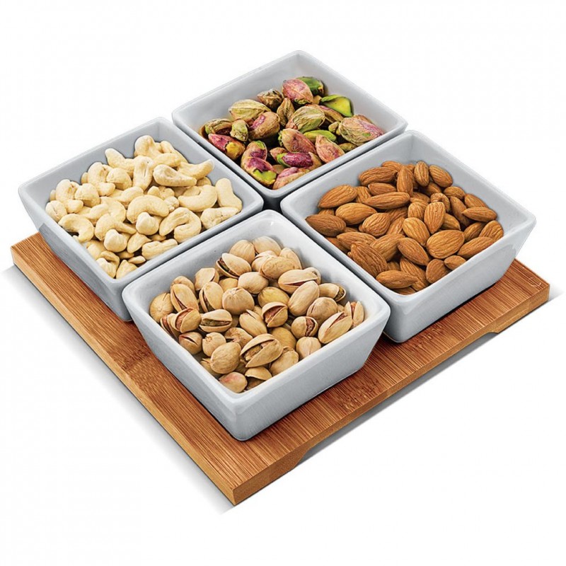 Porcelánová série pro každodenní užitíSada obsahuje 4x misku, dřevěný podnos