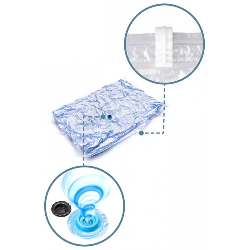 Úložný vak slouží jako ideální ochrana oděvů nebo textílie proti prachu, molům, vlhkosti nebo zápachu.Vak je antibakteriální a obsahuje vzduchotěsné zavírání a odsávací ventil pro všechny typy běžných vysavačů.