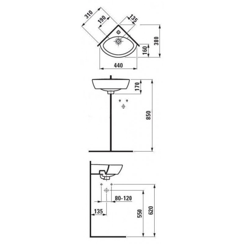 Laufen PRO C Umývátko rohové 44x38 cm, s otvorem, bílé LCC, 8.1695.8.400.104.1- 1 otvor pro baterii uprostřed
