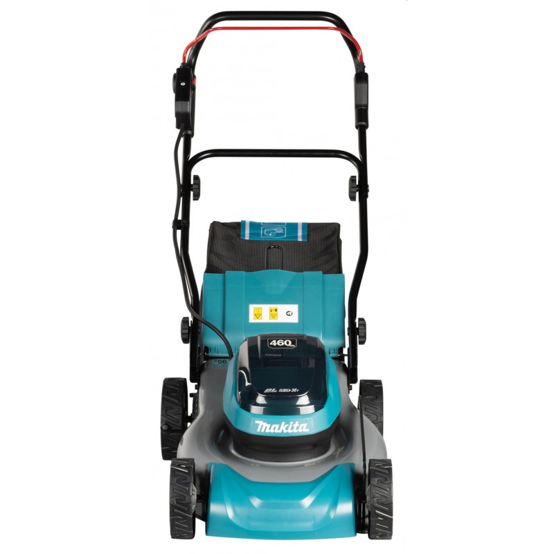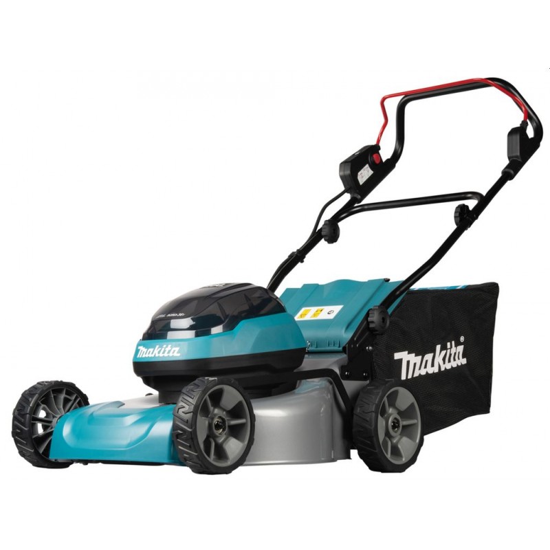 Bezuhlíkový motor zajišťuje konstantní výkon, vyšší účinnost a delší životnost stroje. Komfort obsluhy zvyšuje ergonomická pogumovaná rukojeť s možností nastavení výšky ve třech úrovních bez použití nářadí, elektrická brzda pro vyšší bezpečnost a režim snížené hlučnosti, díky kterému je akustický tlak pouhých 84 dB. Sklopná rukojeť a omyvatelný skelet sekačky usnadňují skladování i údržbu. Součástí dodávky jsou 2× akumulátor BL1850B (18 V / 5,0 Ah), dvojitá rychlonabíječka DC18RC, sběrný koš o objemu 60 l a žací nůž 460 mm.