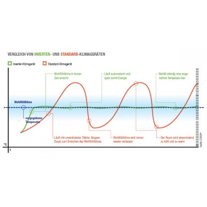 Výhodou inverterové technologie je, že dosáhne nastavené teploty rychleji, využívá o 30 - 40% méně energie, vytváří méně hluku a poskytuje nižší fluktuaci vzduchu v místnosti.