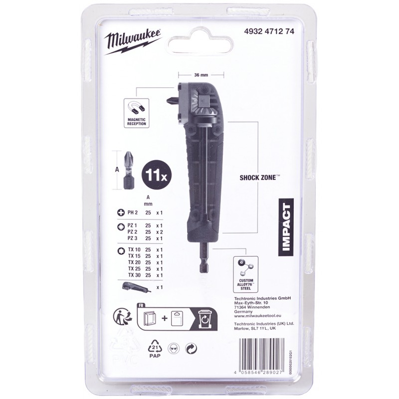 • 1 x pravoúhlý rázový nástavec, 1 x PH2, 1 x PZ1 / 2 x PZ2 / 1 x PZ3, 1 x TX10 / 1 x TX15 / 1 x TX20 / 1 x TX25 / 1 x TX30
