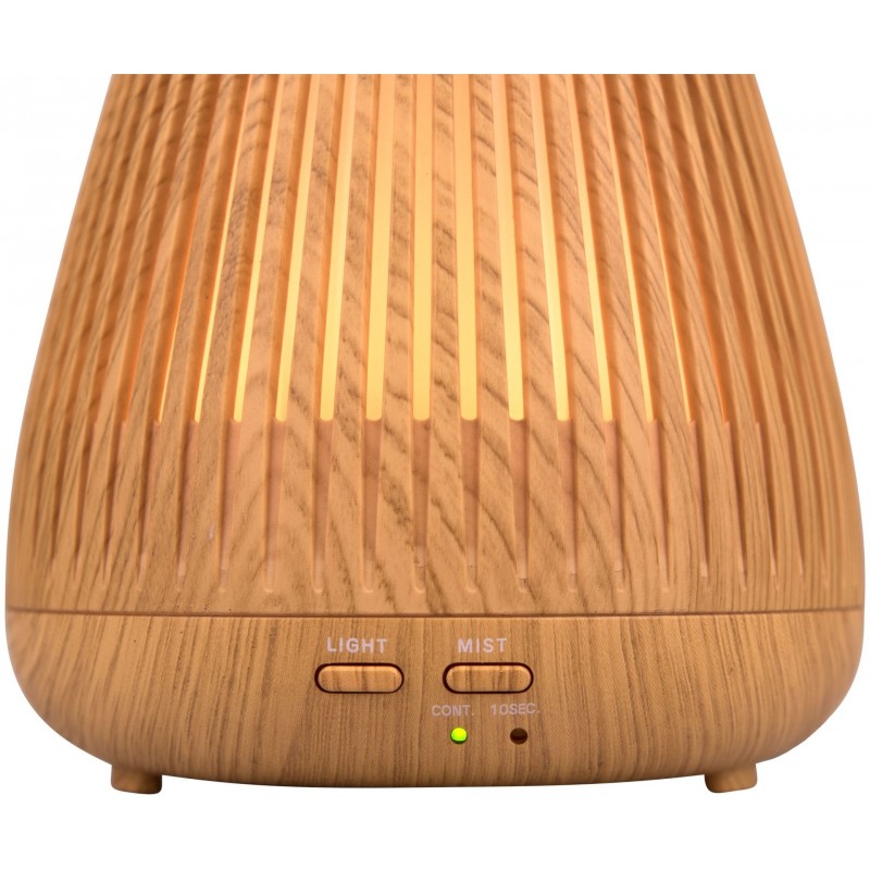CHARAKTERISTIKAZvlhčovač vzduchu s difuzérem v designu přírodního dřeva (imitace dřeva). Aromatizuje a zvlhčuje vzduch kombinací účinků vodní mlhy a esenciálních olejů. Pomocí jemného ultrasonického vlnění rozkládá esenciální oleje na extrémně malé mikročástice, aniž by je zahříval. Oleje si tak zachovávají původní vůni i léčivé účinky. Aroma difuzér vám pomůže vytvořit z každého pokoje vonící oázu a navodit relaxační atmosféru. Bez přidání esenciálního oleje vám aroma difuzér poslouží jako zvlhčovač vzduchu. Přidáním konkrétního esenciálního oleje můžete sobě, nebo vašim blízkým pomoci s různými obtížemi. Postačí pár kapek kvalitního oleje a můžete ulevit rýmě, kašli, bolestem hlavy, nebo špatnému usínání. Správně zvolený olej vyčistí vzduch, nebo vám jednoduše zpříjemní pobyt v místnosti, ve které se právě nacházíte. Díky neutrálnímu designu světlého přírodního dřeva stylově doplní vybavení všech obytných prostor, dětských pokojů, jednacích místností, masážních salónů, wellness center apod. Vhodně zvolenými esenciálními oleji můžete podpořit relaxační atmosféru v ložnici, dezinfekci vzduchu či klidný spánek v dětském pokoji. Koncentraci v pokoji studenta anebo uvolněnou komunikaci, ať už doma nebo v pracovním prostředí. Používejte vždy kvalitní oleje. Použitím levných, umělých olejů sice vytvoříte voňavé prostředí, ale tělo a mysl si neodpočinou. Citlivým osobám může naopak uškodit. Například bolestí hlavy apod. Během provozu aroma difuzéru lze libovolně a jednoduše nastavit světelné efekty, které vytvoří ve vašem pokoji velmi příjemné prostředí a navodí relaxační atmosféru. Aroma difuzér je vhodný všude, kde je z bezpečnostních důvodů nemožné použít otevřený oheň (svíčky v aroma lampách). Kombinuje účinky vodní mlhy a esenciálních olejů. Obsluha aroma difuzéru je velmi jednoduchá. Do zásobníku nalejete vodu, nejlépe destilovanou. Nakapete několik kapek esenciálního oleje a přístroj zapnete stiskem tlačítka MIST (mlha). Aroma difuzér začne okamžitě vytvářet vodní mlhu a rozptylovat olej do vzduchu. Druhým stiskem nastavíte přerušovanou tvorbu mlhy a třetím ho vypnete. Pomocí tlačítka LIGHT můžete nastavit režim barevného podsvícení. Prvním stisknutím nastavíte režim pozvolného rozsvícení a zhasínání světla. Druhým stiskem zastavíte intensitu světla na aktuální úrovni a třetím stiskem světlo vypnete. Nemusíte kontrolovat množství vody v zásobníku. Po vyprázdnění se aroma difuzér sám vypne.