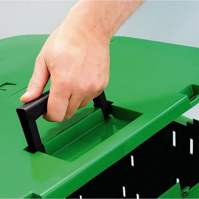 Kompostér je vyroben z recyklovatelného plastu, který je odolný vůči atmosférickým vlivům. Kompostéry v zahradě zaberou minimální prostor. Kompostér nemá dno a přímý styk s půdou tak umožňuje volný přístup červům, kteří se podílejí na procesu dekompozice a na tvorbě plnohodnotného, na živiny bohatého humusu. V dolní části kompostéru je otvor pro vybírání kompostu.