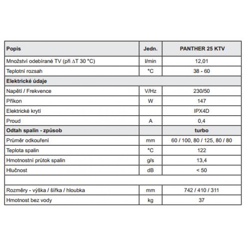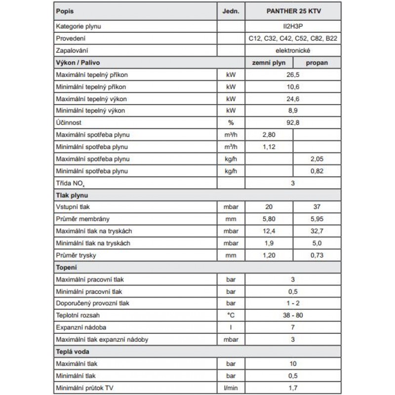 PROTHERM Panther 25 KTV 19 závěsný plynový kotel s průtokovým ohřevem TV 0010008009Kombinované kotle s průtokovým ohřevem TV v deskovém výměníku, plynulá modulace výkonu, autodiagnostika, možnost ekvitermní eBus regulace řady set Thermolink, 7l expanzní nádoba (30 KTV 8l), čerpadlo, všechny bezpečnostní prvky, ochrana proti zamrznutí, digitální ovládání, elektrické krytí IPX4D.