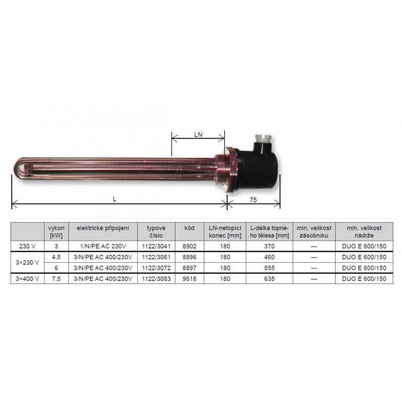 REGULUS topné těleso 7,5 kW, G 6/4“ pro DUO E, neniklované, IP54 9618Elektrická topná tělesa s prodlouženým netopícím koncem jsou určena pro ohřev otopné vody v akumulačních nádržích Regulus s vnořeným zásobníkem TV DUO E. Elektrická topná tělesa bez termostatické hlavice nejsou vybavena provozním ani bezpečnostním termostatem.