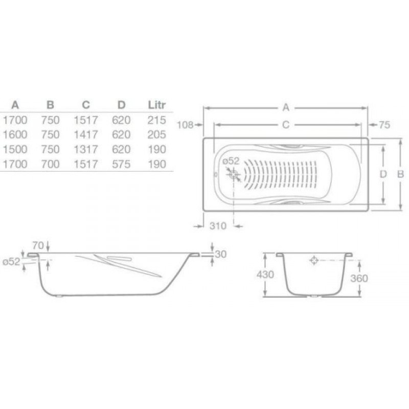Roca Princess-N ocelová vana 170 x 70 cm, 190l, s madly bílá, antislip 7220950001Rozměry výrobku: