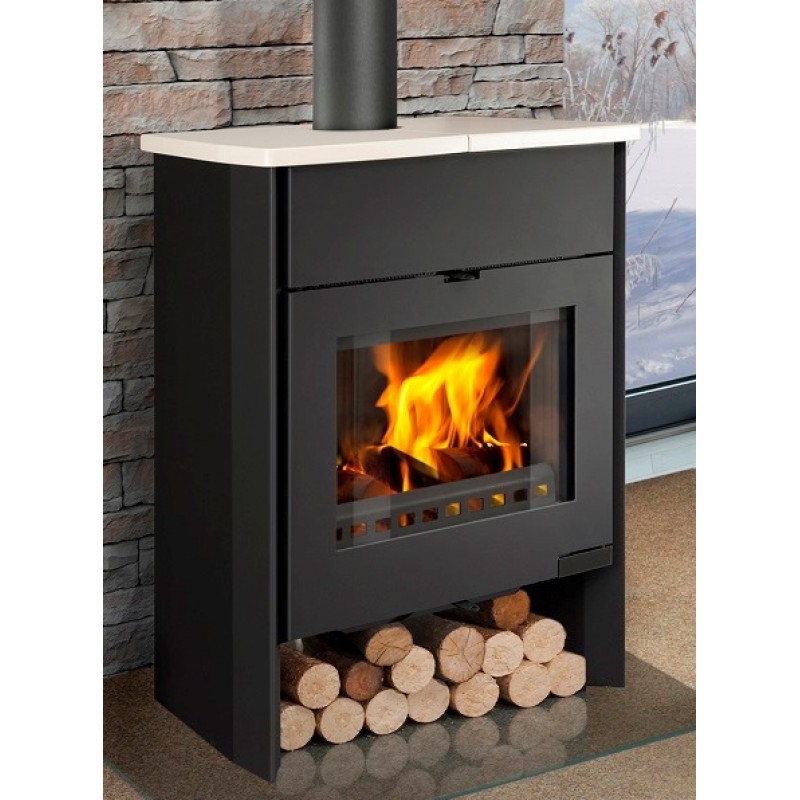 Romotop Riano 02 W krbová kamna, keramika, s teplovodním výměníkemVýkonná krbová kamna s velkým podílem topení do teplovodního pláště najdou uplatnění i ve větších interiérech. Naležato položené topeniště dává kamnům moderní design a umožní spalovat dřevo délky až 50 cm.