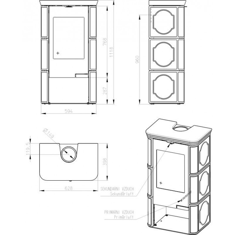 • přívod sekundárního vzduchu, díky kterému je sklo dvířek omýváno, a tak nedochází k usazování nečistot