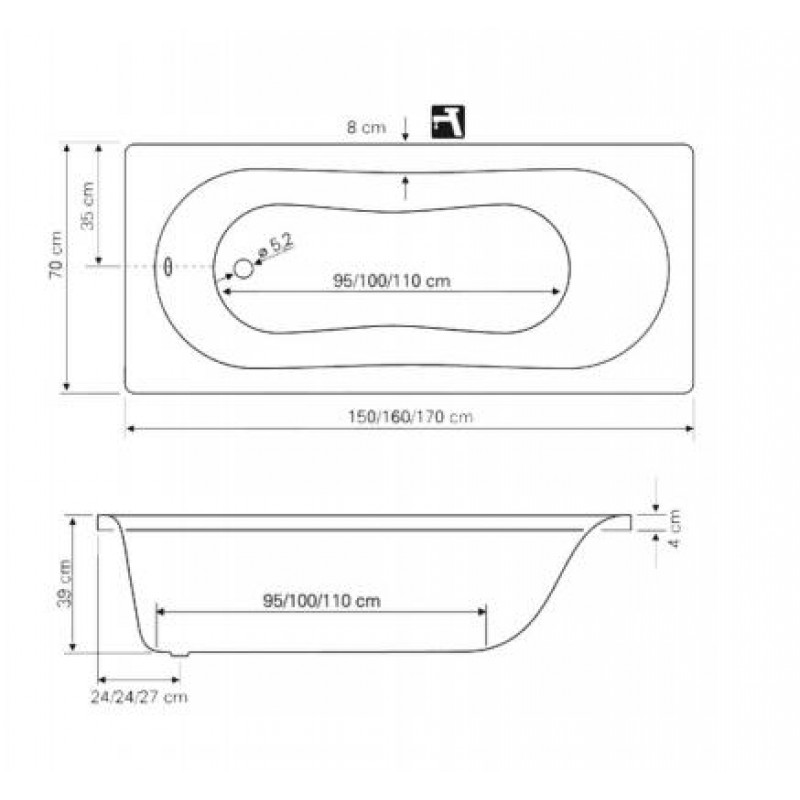 JIZERA vana 170x70x39 cm bez nožiček, bílá G1770Rozměry: