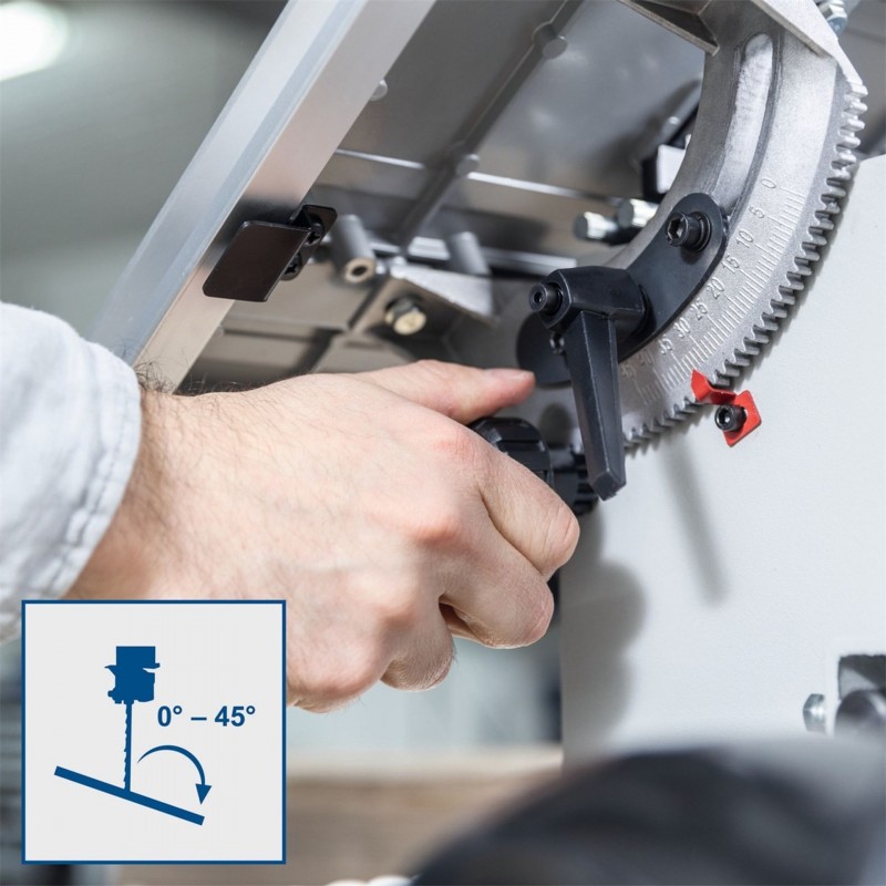 Díky dvěma rychlostem je stroj schopný provádět čisté řezy v různých materiálech i ve dřevu různé tvrdosti. Základem stroje je silný a tichý indukční motor s moderní bezuhlíkovou technologií. Stůl je naklápěcí v rozmezí 0° až 45°, má možnost prodloužení a je vyroben z odolné slitiny hliníku. Ve výbavě nechybí pevné posuvné pravítko s rychloupínáním a přesné úhlové pravítko. Zbytek konstrukce je celokovový.