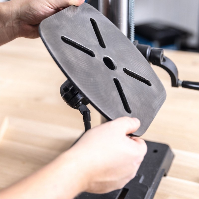 Silný 750W indukční motor poskytuje dostatek výkonu i pro náročnější úkoly a zajišťuje plynulý chod bez vibrací. Masivní litinová konstrukce se sloupem o průměru 65 mm zajišťuje vysokou stabilitu, zatímco velký pracovní stůl 240 × 240 mm nabízí dostatek prostoru i pro větší obrobky. Stůl lze otáčet o 360°, plynule výškově nastavovat a naklápět až o ±45°, což výrazně zvyšuje variabilitu práce.