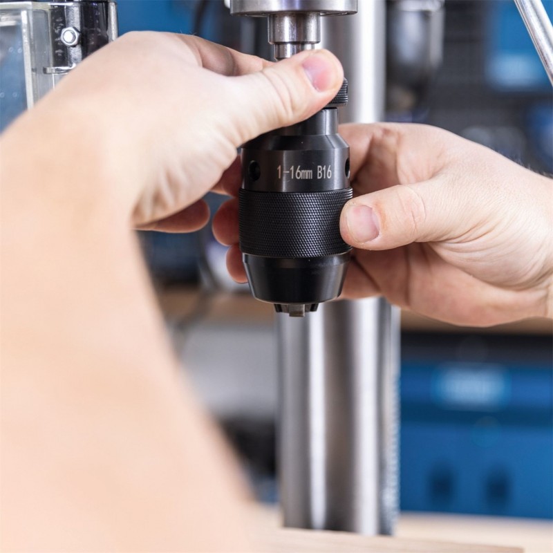 Kvalitní rychloupínací sklíčidlo s kuličkovými ložisky a ochranným krytem pojme vrtáky od 1 do 16 mm. Nastavitelný doraz hloubky zaručuje jednotné výsledky i při sériovém vrtání. Díky velkému výkyvu 152 mm lze opracovávat obrobky o průměru až 304 mm. Pevná základna umožňuje bezpečné uchycení vrtačky k pracovnímu stolu a ergonomická pogumovaná rukojeť zajišťuje pohodlné ovládání i při delší práci.