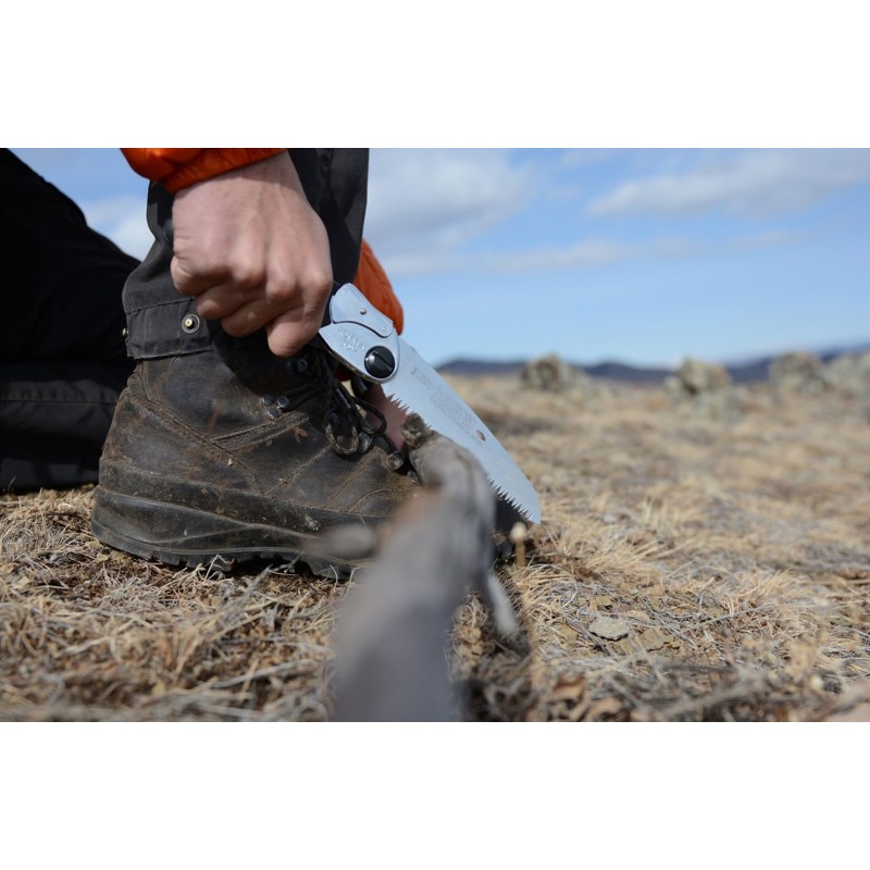 Pilu lze jednoduše složit a rozložit pomocí aretačního tlačítka, které umožňuje nastavit 2 různé polohy řezání. Gumová rukojeť tlumí vibrace a zajišťuje bezpečný a pohodlný úchop. V rukojeti se nachází otvor pro karabinu nebo lano. Po složení je ostří bezpečně ukryto v rukojeti, což zvyšuje bezpečnost.