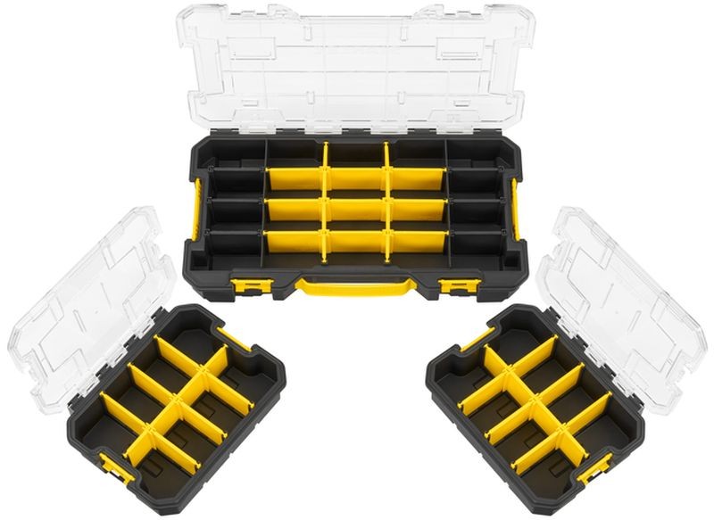 Sada 3 organizérů FatMax Pro-Stack – modulární úložiště pro malé díly Sada obsahuje 3 organizéry pro přehledné uložení drobných součástek, příslušenství a nářadí Vyjímatelné přepážky pro snad... Zobrazit celý popis »