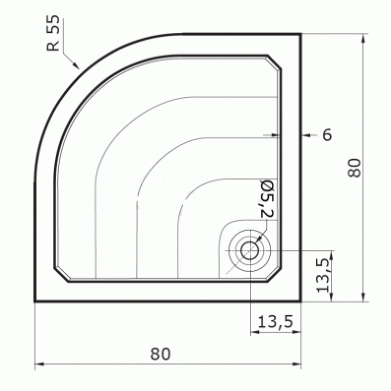 Čtvrtkruhová sprchová vanička SANO 80 se vyrábí v provedení s protiskluzem. Sprchová vanička SANO 80 je vhodná v kombinaci se sprchovými zástěnami s radiusem R55.